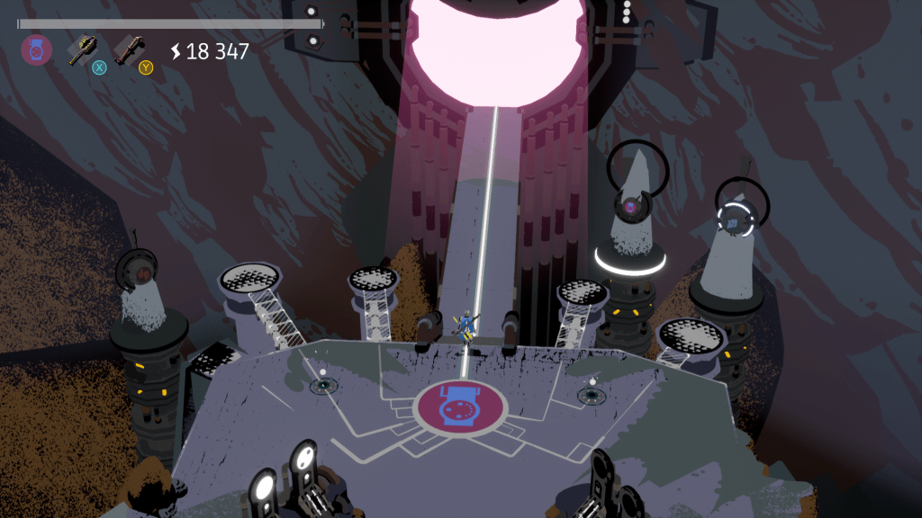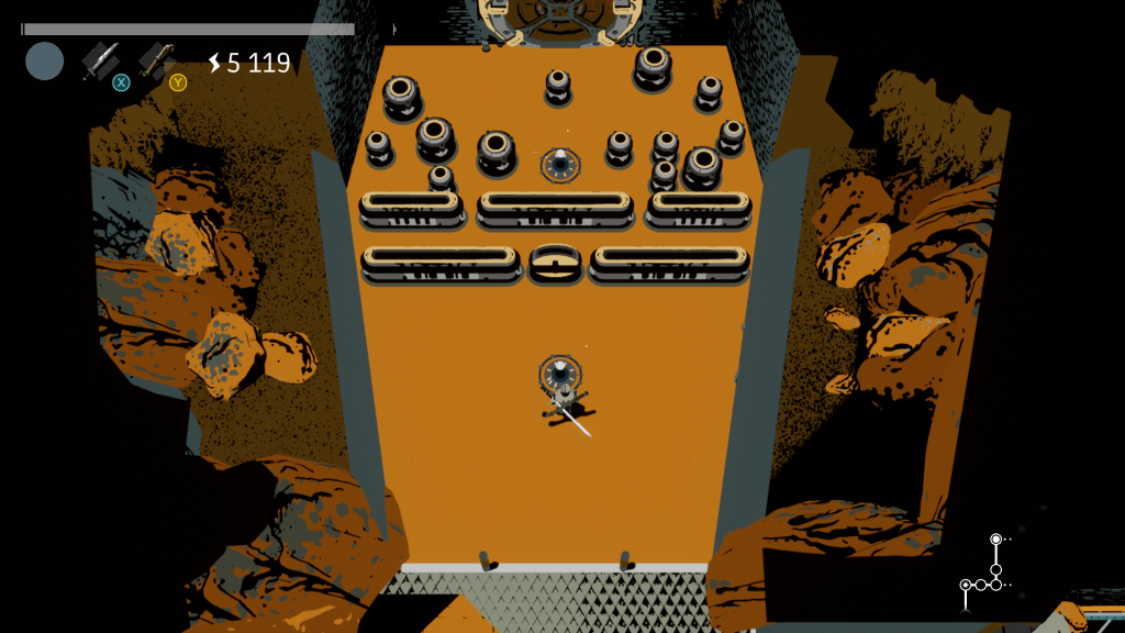 Et c’est tout cela qui constitue le gameplay de Creature in the Well. Ce mélange entre Hack’n Slash exigeant par son nombre d’éléments auxquels il faut faire attention pour ne pas mourir et la précision exigée par un flipper donnant un tout assez cohérent bien qu’assez difficile.