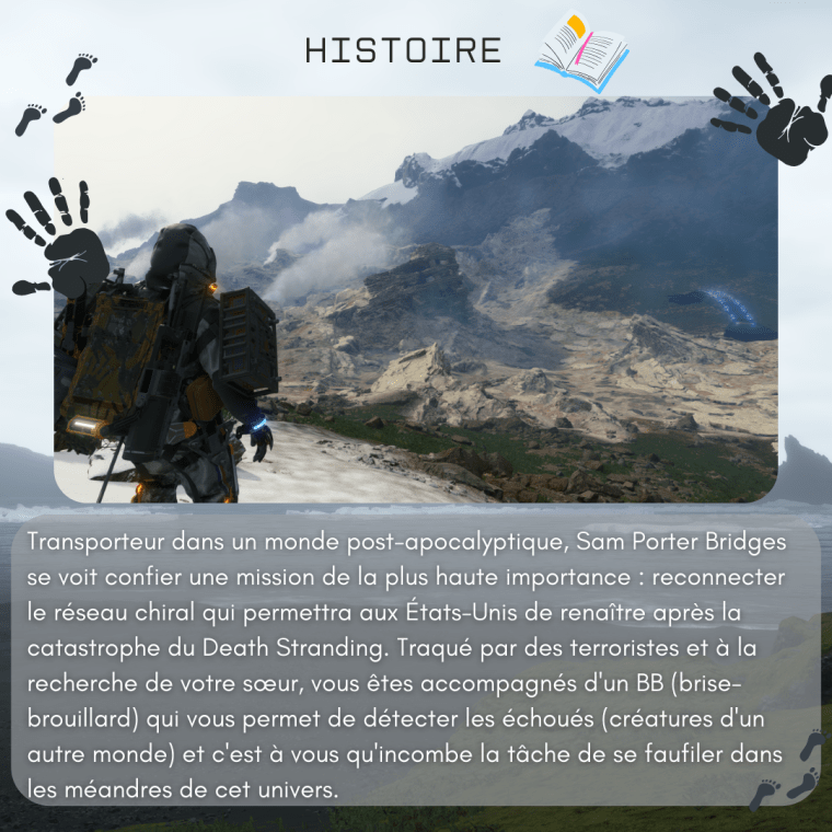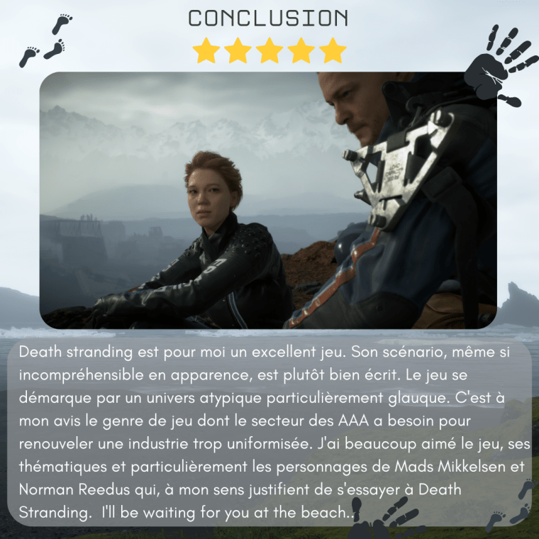 1. Je n’Ă©tais pas attirĂ©e par Death Stranding Ă  cause de ses bandes-annonces Ă©tranges et surtout son gameplay. Comme je me trompais ! J’ai moi aussi Ă©tĂ© happĂ©e par l’univers. Je n’ai pas trouvĂ© les mĂ©caniques rĂ©pĂ©titives mais plutĂŽt hypnotisantes. Ne parlons pas de l’histoire et des personnages qui m’ont complĂštement fascinĂ©e et Ă©mue. Ce jeu m’a vraiment marquĂ©e.