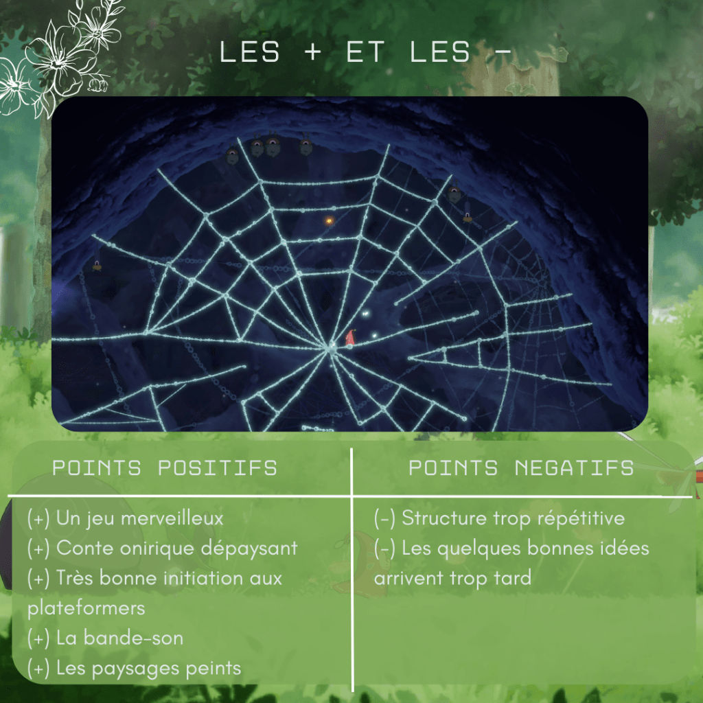 Un exemple qui illustre bien cette idée serait pour moi la phase de la toile d’araignée. En tant que joueur aguerri mon premier réflexe était : Toile d’araignée = araignée = danger imminent. Sauf que non, dans Hoa, une toile d’araignée équivaut à un petit labyrinthe tout mignon sans aucun danger. C’est ce type de contraste que j’ai beaucoup apprécié.