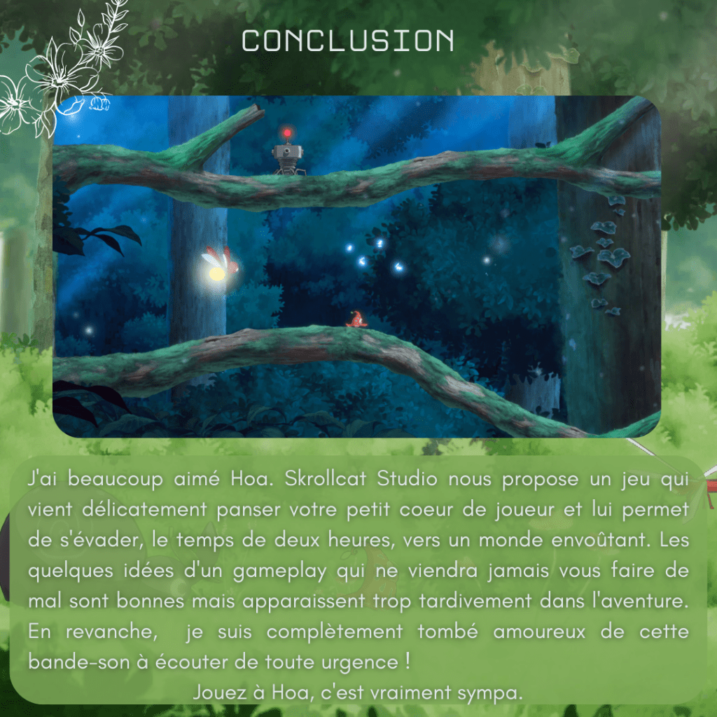 Cela n’empêche pas Hoa d’être une petite crème du jeu vidéo, une pause vidéo-ludique que je recommande à tous les joueurs en plus d’être une excellente initiation aux jeux vidéo.