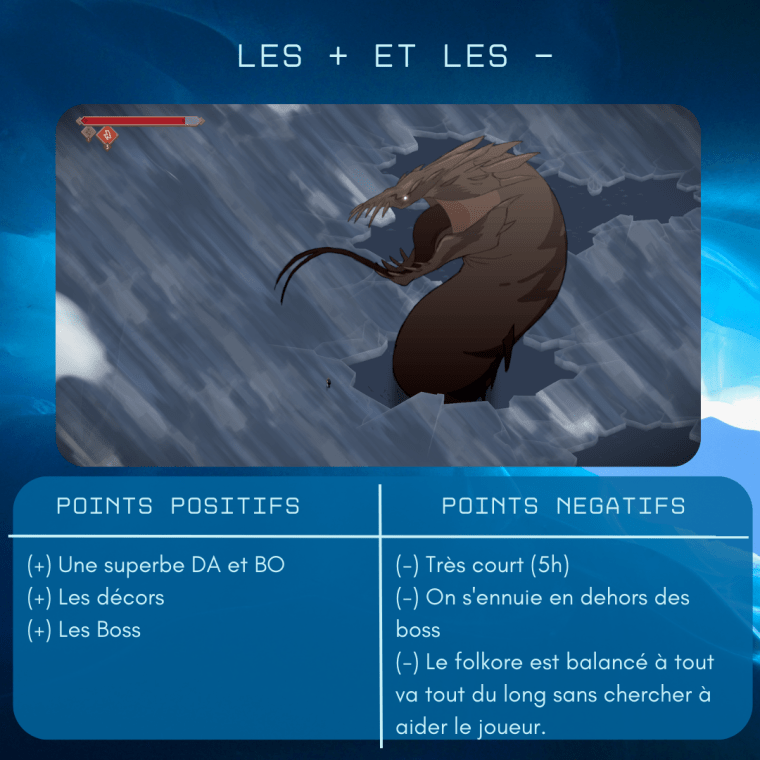 Il n’empêche qu’au bout de 5h, après l’avoir terminé, j’en ressors avec une certaine déception d’un jeu qui en fait trop peu côté divertissement mais qui mérite tout de même de l’attention pour sa direction artistique et sa bande-son.