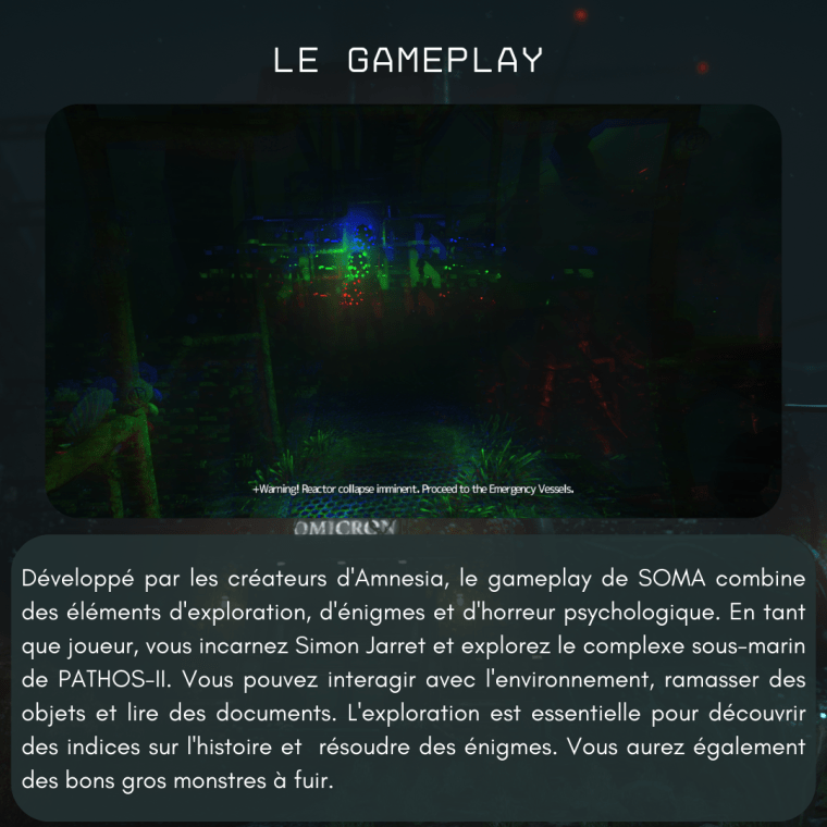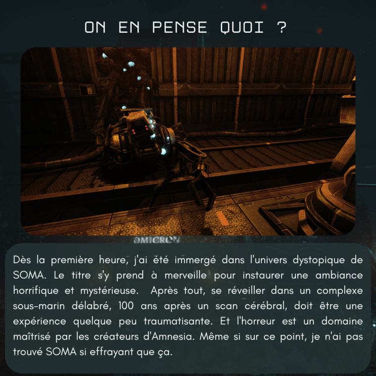 Logique ! Me direz vous puisque SOMA est une crĂ©ation de Frictional Games, studio rĂ©putĂ© pour… Amnesia justement.