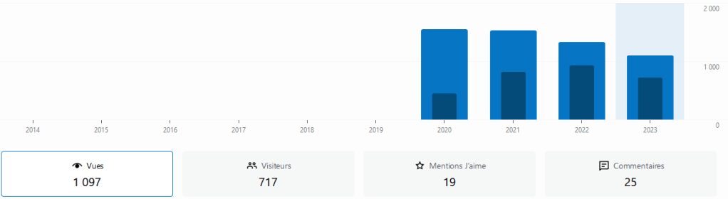 A ce jour, le 04 Septembre 2023, un total de 5910 vues sont enregistrées sur le site au bout de trois ans pour un total de 3191 visiteurs. A mon modeste niveau, je suis satisfait de ce résultat même si on en veut toujours plus ^^. La donnée intéressante est que le nombre de visiteurs augmente d’années en années, ce qui montre un intérêt croissant pour le site et un meilleur référencement. Pour être honnête, je n’y connais pas grand chose de ces aspects-là et fais juste au mieux avec les connaissances dont je dispose. Il ne fait aucun doute que bien manier le Web + les réseaux sociaux seraient un plus pour le site.