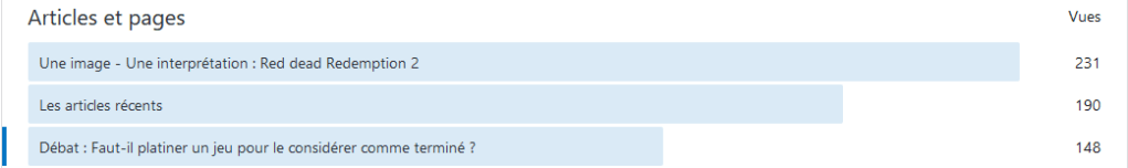 Au-delà de tout ça, je valorise plus le succès de l’article « Le débat sur les succès » qui a généré le plus de commentaires aussi bien sur le site que sur Instagram avec 48 commentaires (dont les miens) pour 138 vues. C’est un résultat intéressant qui montre qu’une demande existe. J’imagine qu’avec les récents affaiblissement culturels des sites de JV les plus connus, ceux qui veulent aller plus loin que le simple test s’y retrouvent dans des blogs comme le mien ou LittleGamers et celui d’Hauntya (que je recommande vraiment).