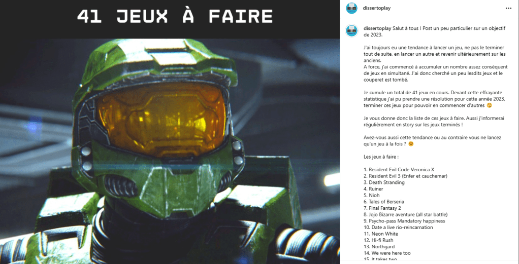 Ce n’est que cette année que j’ai vraiment commencé à réfléchir à mon utilisation de la plateforme. Tout d’abord, une publication appelée « 41 jeux à faire » visait à parler de ma manie de lancer des jeux sans forcément avoir terminé les précédents au point de me retrouver avec 41 jeux en cours. Cette publication, en plus de générer des échanges intéressants, me permet de publier régulièrement en story un avis rapide sur un jeu (en plus de me forcer à enfin les faire). A ce jour, j’en suis au 18ième de la liste.