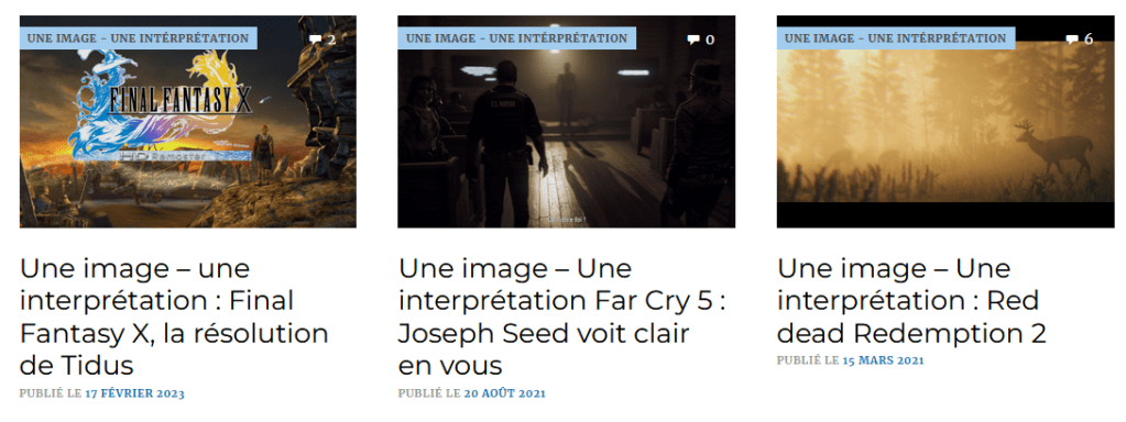 Mais clairement, cela ne me suffisait pas, d’où l’apparition du premier article « Une image – une interprétation » consacré à Red Dead Redemption II qui est aujourd’hui encore le plus gros succès du site. (On reviendra sur les statistiques un peu plus tard.) Avec ce type d’articles, je pouvais enfin réunir des informations sur un jeu via une image puis développer toute une interprétation des évènements. Intellectuellement parlant, c’est extrêmement stimulant pour moi, j’analyse, j’apprends, j’interprète et on peut en discuter ensemble. A ce jour, trois articles de ce genre existent, Red DeadFar Cry 5Final Fantasy X. Je les aime tous les trois mais j’ai rapidement vu le temps nécessaire à la création de ces articles puisqu’il me faut non seulement chercher une image intéressante à interpréter mais aussi faire les recherches parfois laborieuses pour être en capacité de l’analyser.