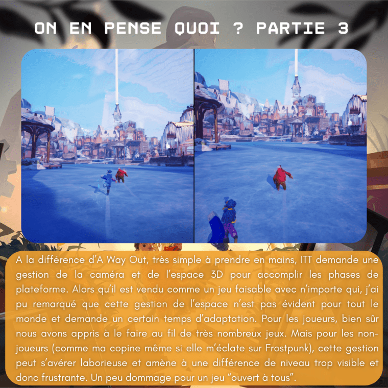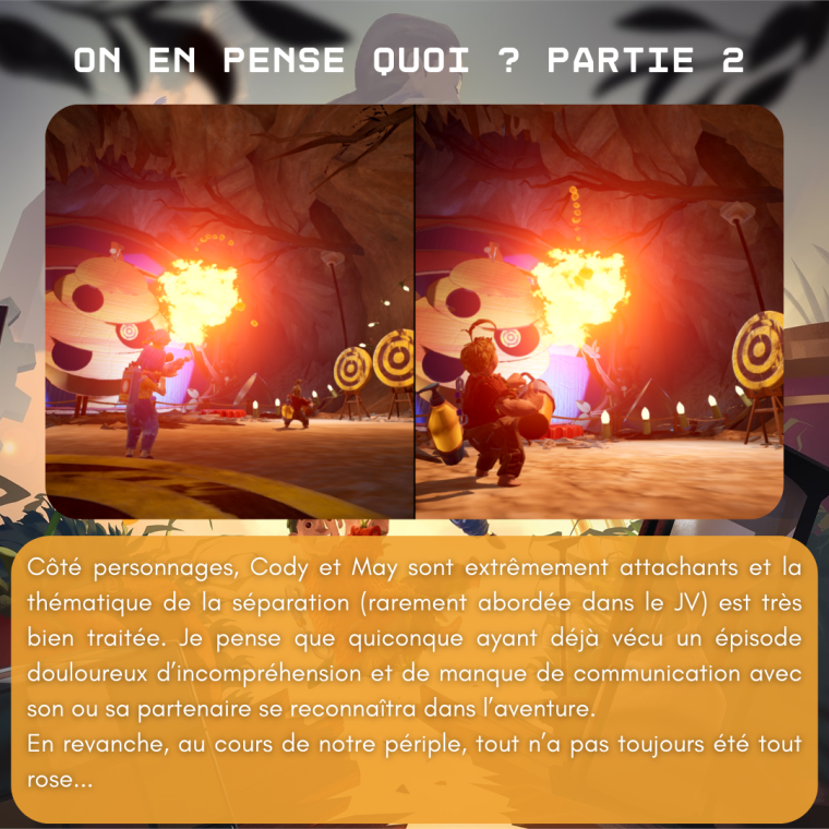 • C’est une excellente expĂ©rience oui ! J’avais fait A way out Ă©galement que j’ai trouvĂ© meilleur dans la dynamique du scĂ©nario mais Ă©videmment moins bon en termes d’idĂ©es de gameplay. J’ai hĂąte aussi c’est du trĂšs bon. Surtout que les jeux vraiment coop se font rares, je crois que tu en parlais dans un de tes articles justement.