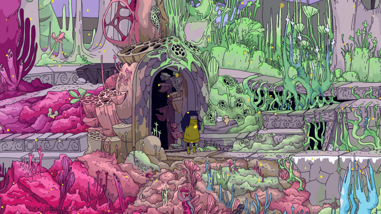 Cet enjeu majeur de l’aventure est constamment rappelé par la direction artistique. Où que vous regardiez dans Minute of Islands, vous contemplez la désolation, la mort ou le début de l’infection via les mycoses. En effet, Cette DA joue habilement avec un contraste entre l’aspect enfantin des couleurs très vives utilisées (rappelant des dessins animés de notre enfance) et toute cette horreur liée à la décomposition des chairs, à l’image d’un épisode d’Happy Tree Friends. Mais ce contraste est également perceptible via les mots employés. La narratrice qui vous accompagne et les textes sous-titrés lorsque vous observez un élément vont évoquer des termes des champs lexicaux des machines et de la mécanique alors que vous interagissez avec des objets organiques. Ces antithèses graphiques saisissent à la gorge et rendent naturel l’artificiel et ce même paradoxe est observable tout au long du jeu.