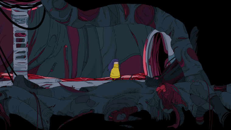 Par exemple, après la cinématique d’introduction où vous voyez Mo être « connectée » aux géants via l’Omni-clé, celle-ci sort de sa « maison ». Son campement dans la caverne semble être un atelier purement fait de la main de l’homme et pourtant, lorsque vous en sortez, la « porte » ressemble à une artère, mais pourrait tout aussi bien être interprétée comme un anus, ou un vagin qui s’ouvre à votre passage et, dans le cas de Mo, nous pourrions penser que c’est par cet orifice que le personnage « vient au monde ». La métaphore se filerait via le cordon ombilical qui la relie aux géants dans la cinématique d’introduction.